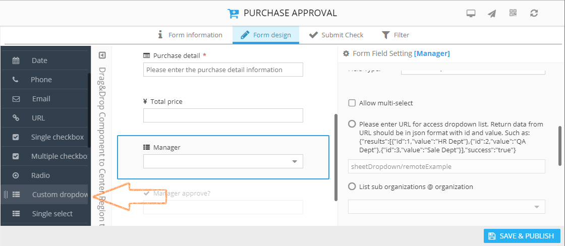 Select one of the defined object in the page, this field will be linked to the selected object. For example, the manager field in above example will be linked to the specific organization user list in the system.